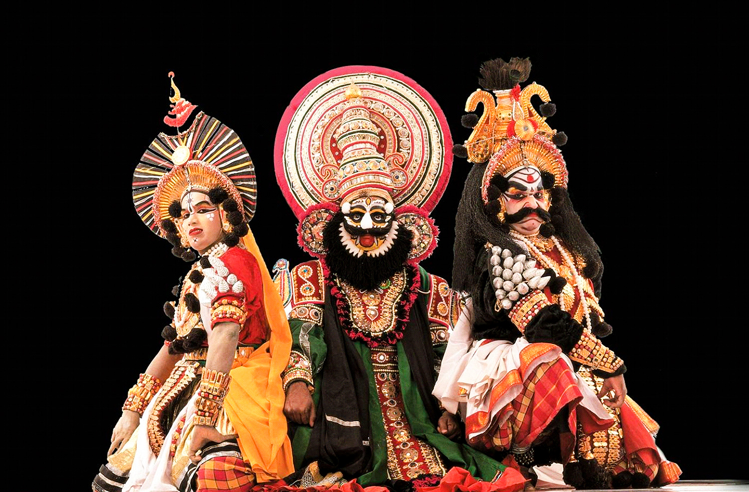 - Yakshagana: A trip to the coastal belt would be incomplete without watching the Yakshagana – an elaborate dance drama performance unique to Karnataka. It is a rare combination of dance, music, song, scholarly dialogues and colourful costumes. A celestial world unfolds before the audience, as loud singing and drumming form a backdrop to dancers clad in striking costumes. Hence the name Yaksha (celestial) Gana (music). This is a night-long event, with elaborately adorned performers dancing to the beat of drums in open-air theatres – usually in the village paddy fields after the winter crop has been harvested. Traditionally, men portray all roles, including the female ones, though women are now part of Yakshagana troupes. A typical troupe consists of 15 to 20 actors and a Bhagavatha, who is the master of ceremonies and the main story teller. The performances draw crowds from far and wide, with a fair-ground atmosphere pervading the venue till dawn.