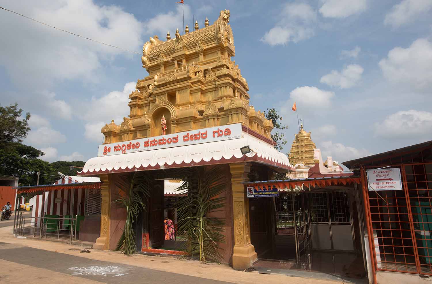 - Nuggikeri Hanuman Temple, Dharwad: Nuggikeri Hanuman Temple is situated across the lake on the outskirts of Dharwad city. It is believed here that the Pratima of Sri Nuggikeri Hanuman was consecrated and worshipped by King Janamejaya, the great-grandson of Arjuna. Later in the 16th century, Shri Vyasaraja Teertha did punar-pratishthapana of the moorthi. Sri Hanuman is holding a sougandhika pushpa, has a shikha on his-head, and has a yajnyopaveeta.